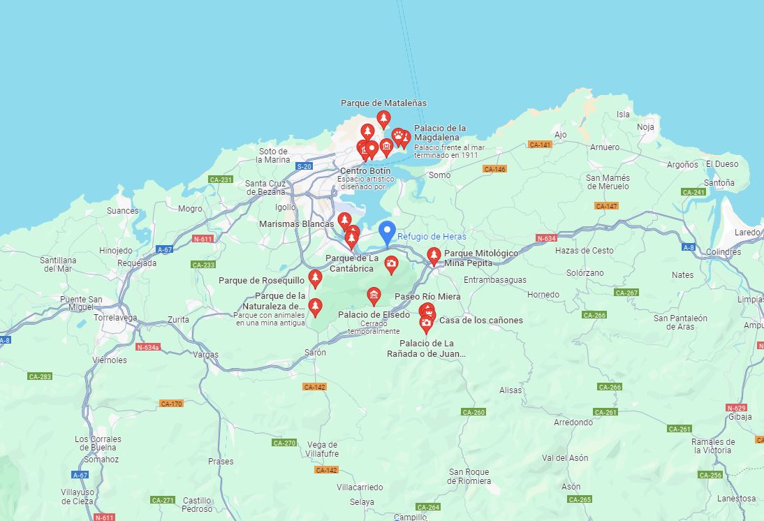 Pincha en el Mapa para localizarnos en Google Maps. Explora las zonas de interés turístico como el parque de Cabárceno, las playas del Sardinero, Santillana del Mar o el mirador de Peña Cabarga.